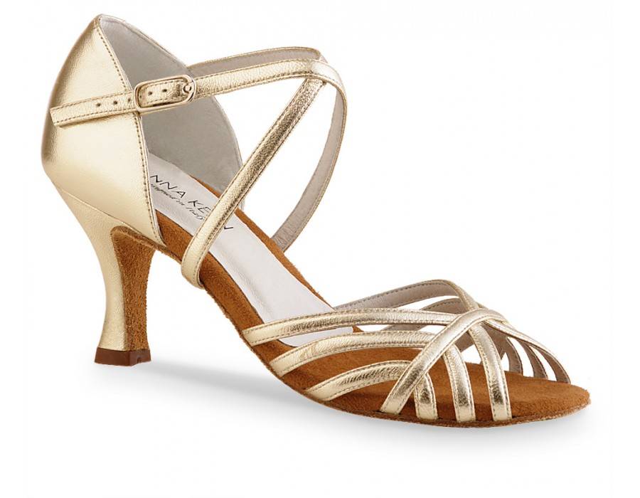 Deze schoen van Anna kern ziet er niet alleen prachtig uit,maar is ook comfortabel. De combinatie van het aparte design van de dansschoen met het gekruiste, verstelbare enkelbandje zorgt voor een goede pasvorm en heeft een stabiele hak. De schoen is gemaakt van soepel nappa-leer met een zachte en flexibele suède zool. De gesp op het enkelbandje is nikkelvrij. Door de mooie gouden kleur is het ook een prima bruids of galaschoen.