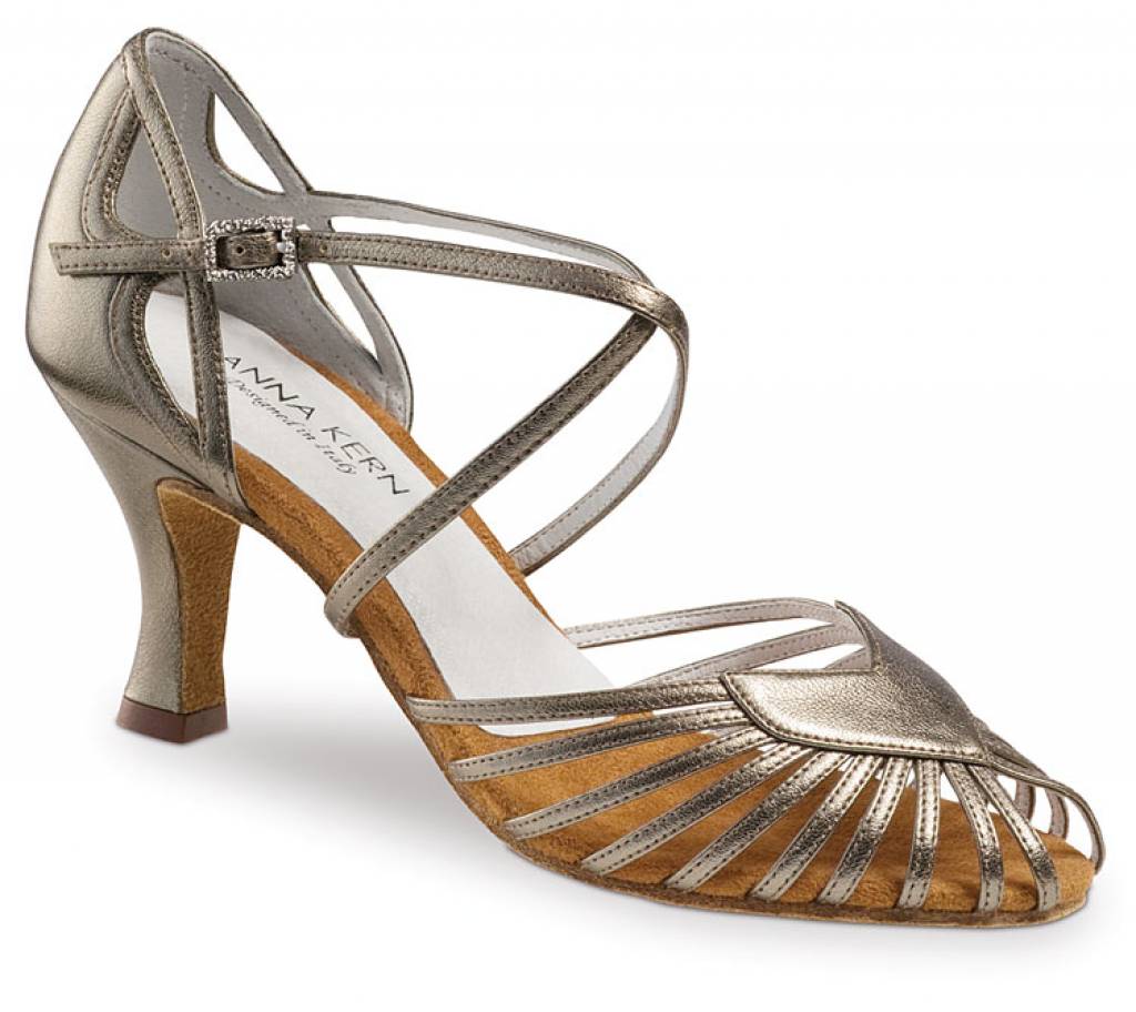Deze schoen van Anna kern ziet er niet alleen prachtig uit,maar is ook comfortabel. De combinatie van het aparte design van de dansschoen met het gekruiste enkelbandje en de uitsnijdingen in de hiel, zorgt voor een goede pasvorm en heeft een stabiele hak. De schoen is gemaakt van soepel nappa-leer met een zachte en flexibele suède zool. De gesp op het enkelbandje is bewerkt met strassteentjes. Door de mooie chevro antik kleur is het ook een prima bruids of galaschoen.