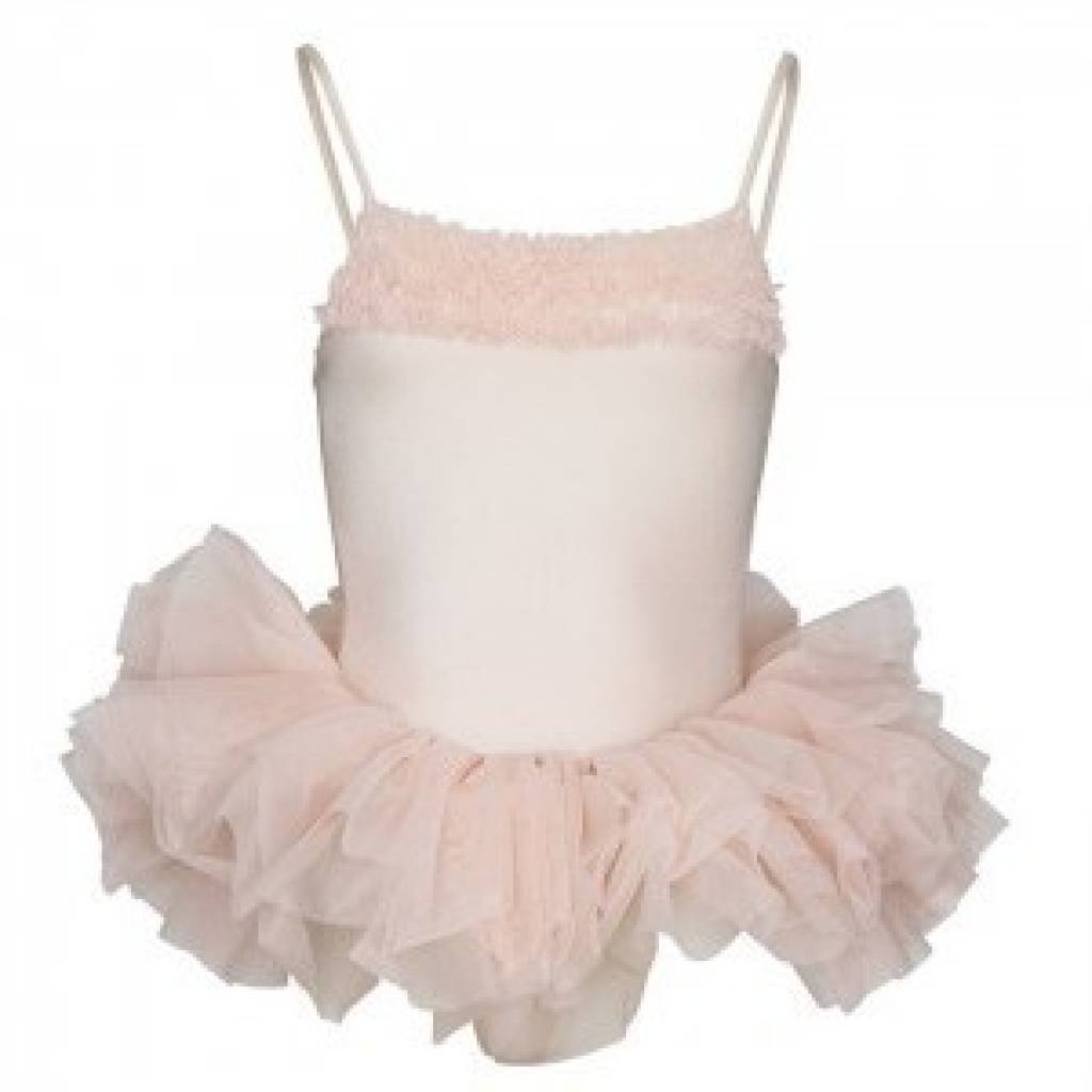 Balletpakje met spaghetti bandjes. Mooi detail langs de neklijn van gesmokte tule. Het pakje is dubbelgelaagd aan de voorkant tegen doorschijnen.