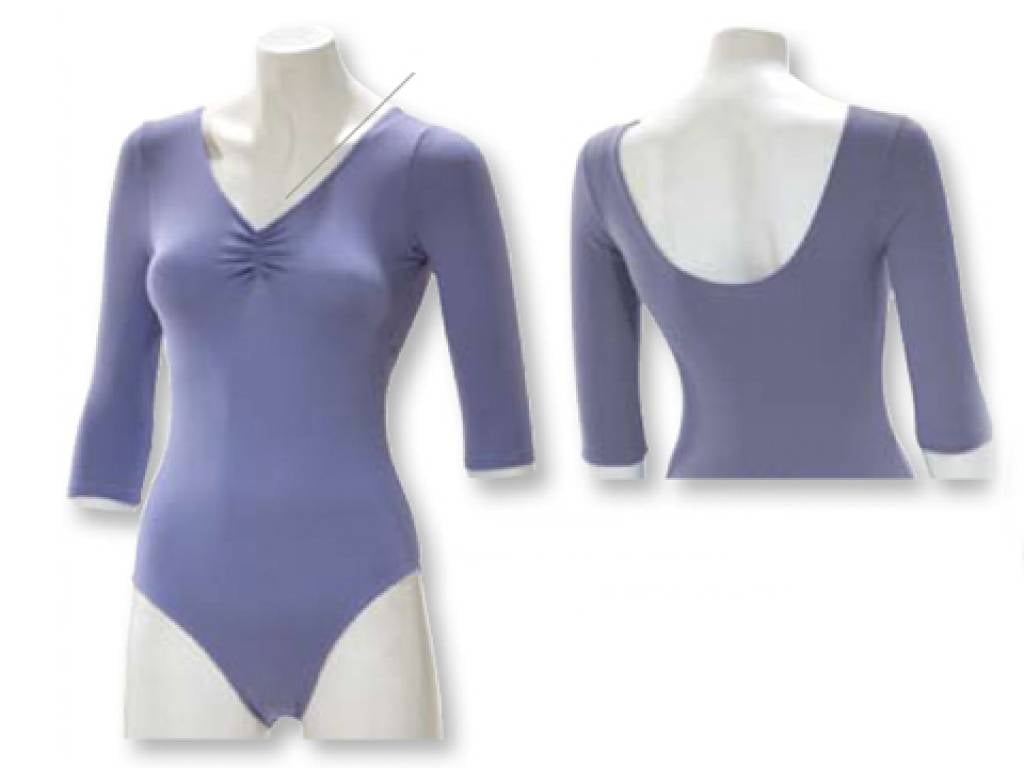 Balletpak ¾ mouw. Door middel van een verstelbaar koordje aan de binnenzijde kan men kiezen voor een gerimpelde voorkant of een ronde hals.