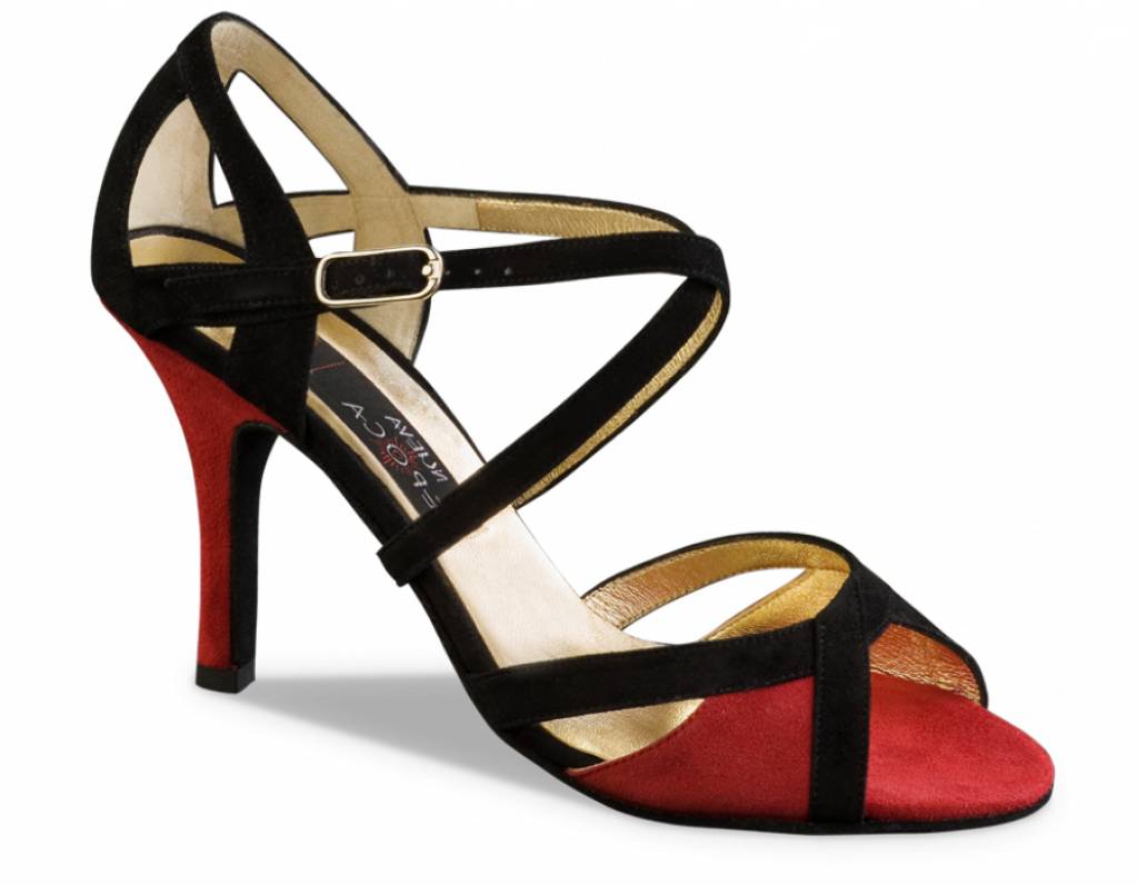 Dansschoen Paulina van Nueva Epoca is een elegante, tweekleurige dansschoen in zwart en rood suede. De schoen blijft perfect om de voet zitten door middel van kruisbandjes met nickelvrije sluiting. Paulina heeft net als alle andere Nueva Epoca schoenen, een schokabsorberende demping, een uitstekende pasvorm en een flexibele zool. Voor Tango salons en Salsa avonden een echte blikvanger.