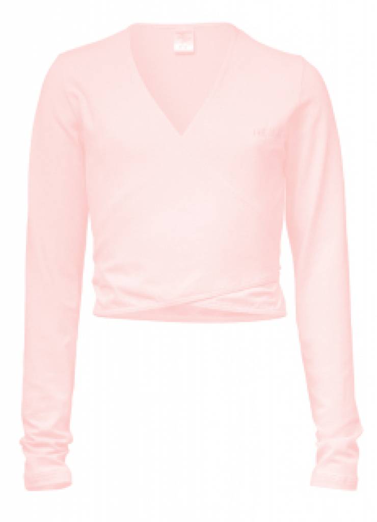Overslagvestje met aangestikt ceintuur om achter vast te knopen. Het vestje heeft lange mouwen, kan ook makkelijk 1 keer omgeslagen worden bij de polsen.