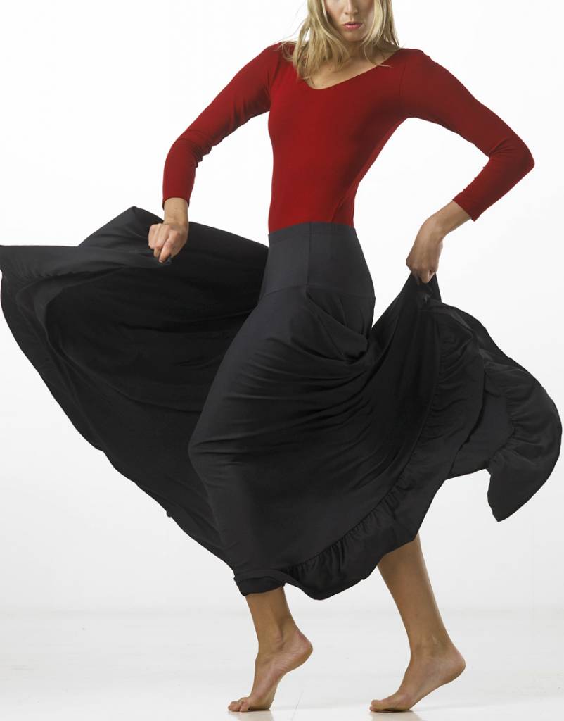Flamencorok Valencia van Temps Danse is een soepele, volle dansrok van viscose. Deze rok is uitermate geschikt voor mensen die liever geen synthetische stoffen dragen. De rok heeft een comfortabele pasvorm en is van uitstekende kwaliteit. Het is mogelijk om onder de rok een body of balletpak te dragen. Ook is de Valencia prima te combineren met een top of wikkelvest.