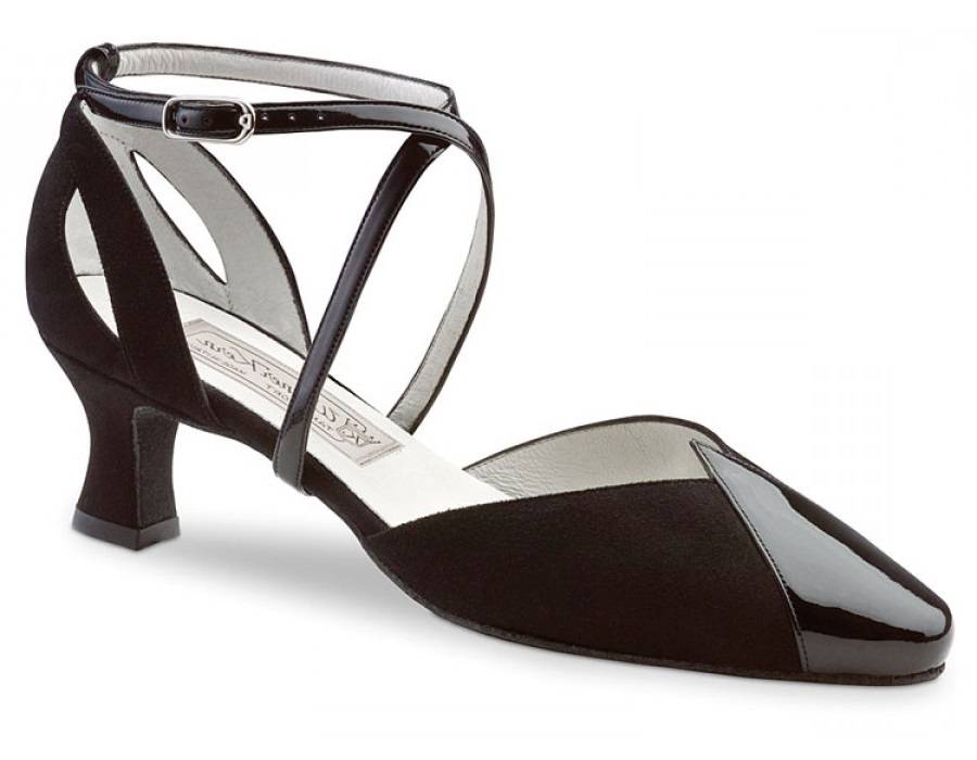 Dansschoen Kim is een dichte schoen, met een lakleren detail op de neus en cut-out motief op de hiel wat een elegante uitstraling geeft. De schoen is gemaakt van soepel suède-leer en heeft een leren lining. Kim heeft een hak van 5,5 centimeter, de hakhoogte en breedte zorgen voor een stabiel en zeker gevoel op de dansvloer. De zool is eveneens van suède en maakt het mogelijk om makkelijk te draaien zonder uit te glijden. Het enkelbandje met nikkelvrije gesp is verstelbaar voor een goede pasvorm.
